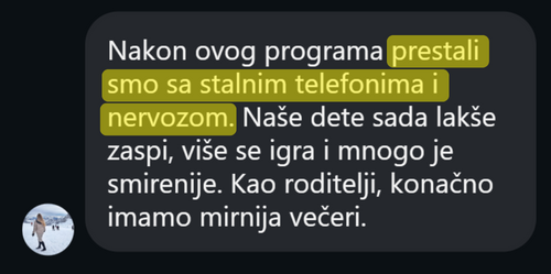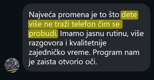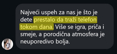 Umesto stalnih pregovora i stresa, dobićeš mirniju rutinu, više saradnje i više porodičnog vremena uživo. Odnosi se popravljaju, granice postaju jasne, a dete razvija samokontrolu i sigurnost – bez nervoze i beskrajnih rasprava oko ekrana.
