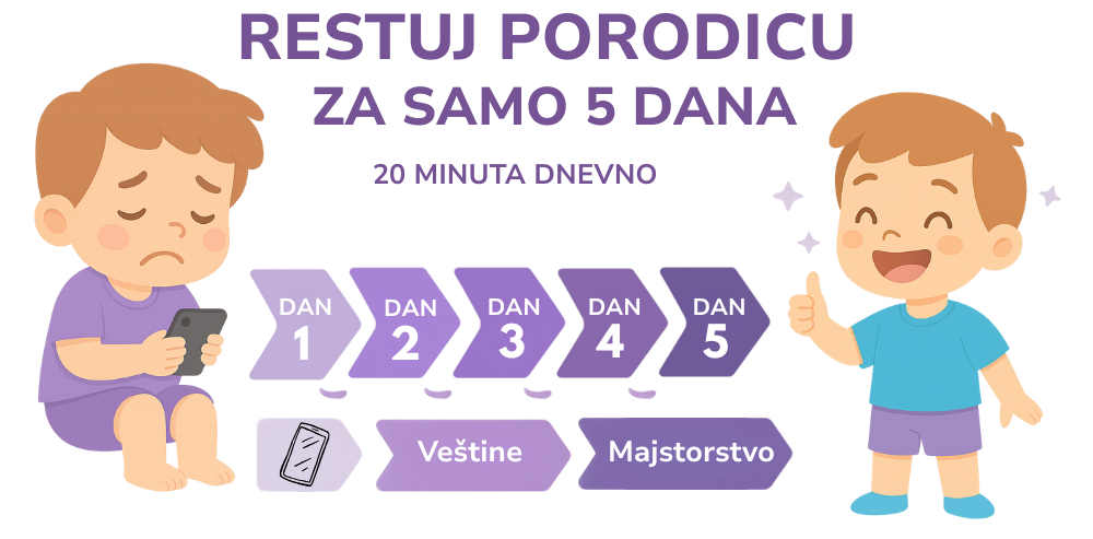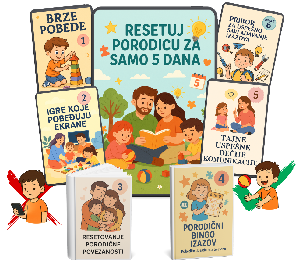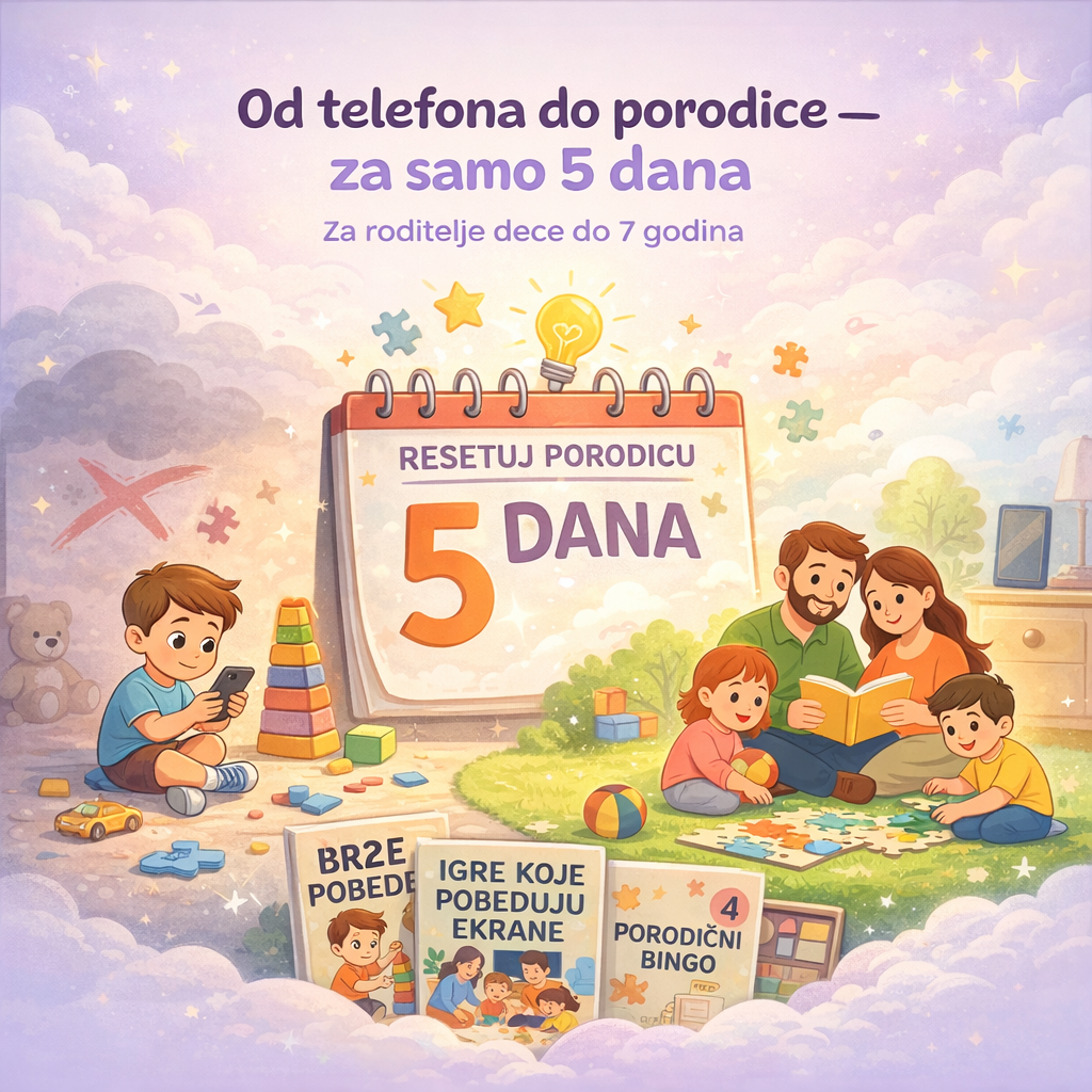 Resetuj Porodicu je praktičan, sveobuhvatan program napravljen da roditeljima pomogne da za samo 5 dana smanje zavisnost od telefona i društvenih mreža kod dece mlađe od 7 godina i vrate mir u svoj dom — bez vikanja, pretnji i beskonačnih pregovora.